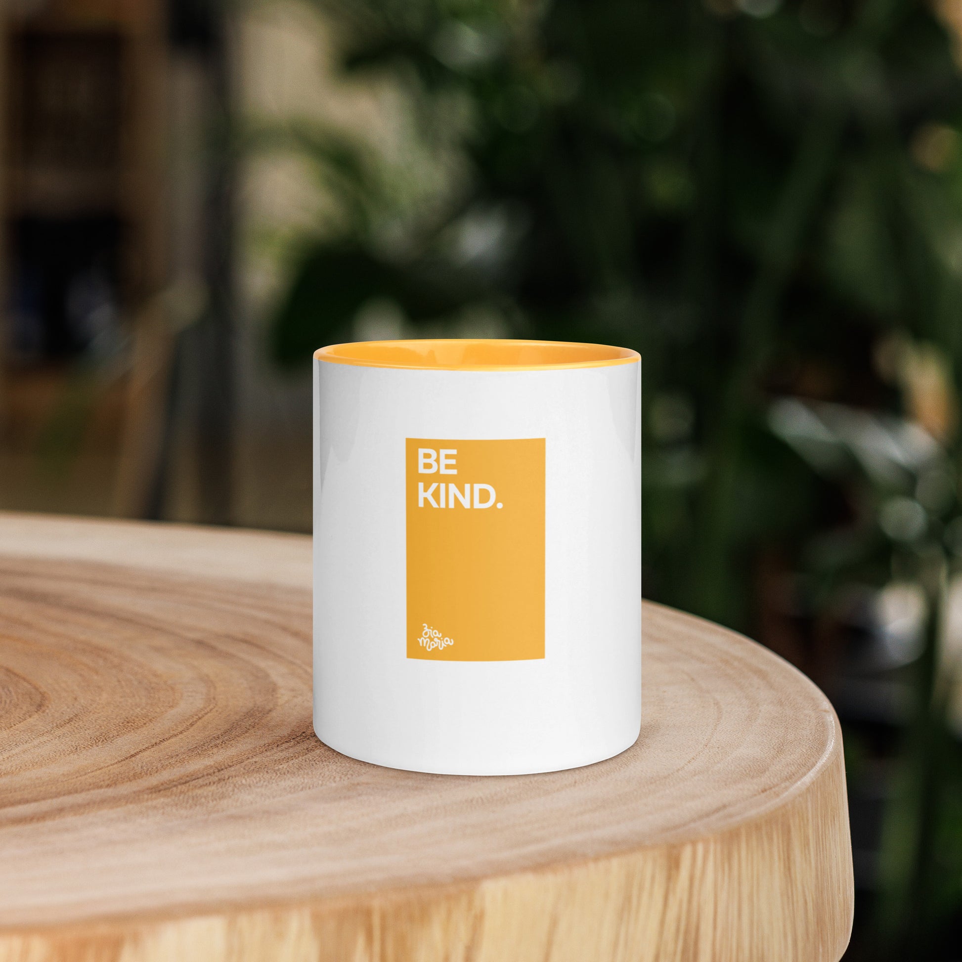 Made from sturdy ceramic and available in multiple colors -yellow, green, red, black, blue, orange, pink- each mug features a colored rim, handle, and interior, with the “Be Kind” square in matching tones.