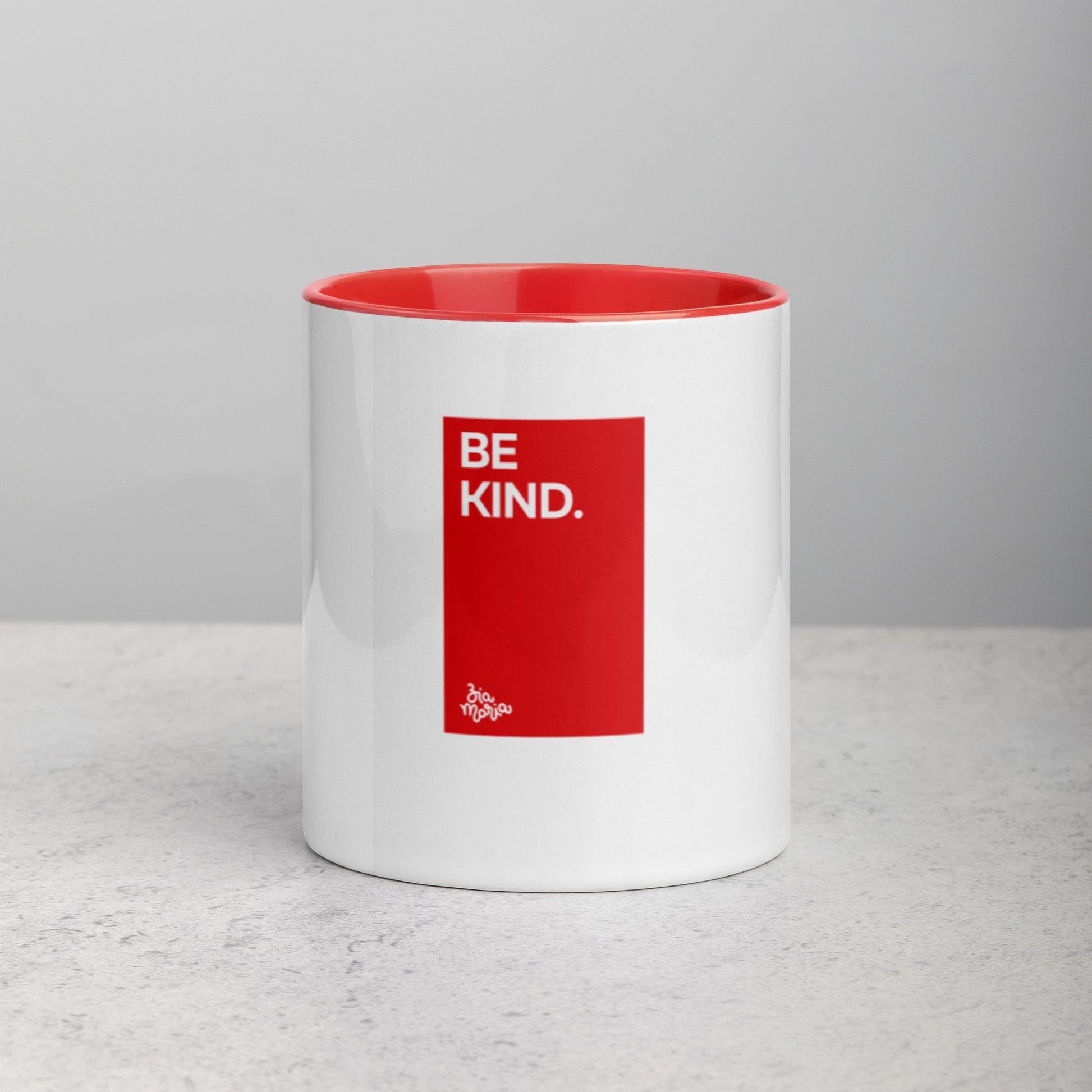 Made from sturdy ceramic and available in multiple colors -yellow, green, red, black, blue, orange, pink- each mug features a colored rim, handle, and interior, with the “Be Kind” square in matching tones. Perfect for your kitchen, your office, or as a gift.