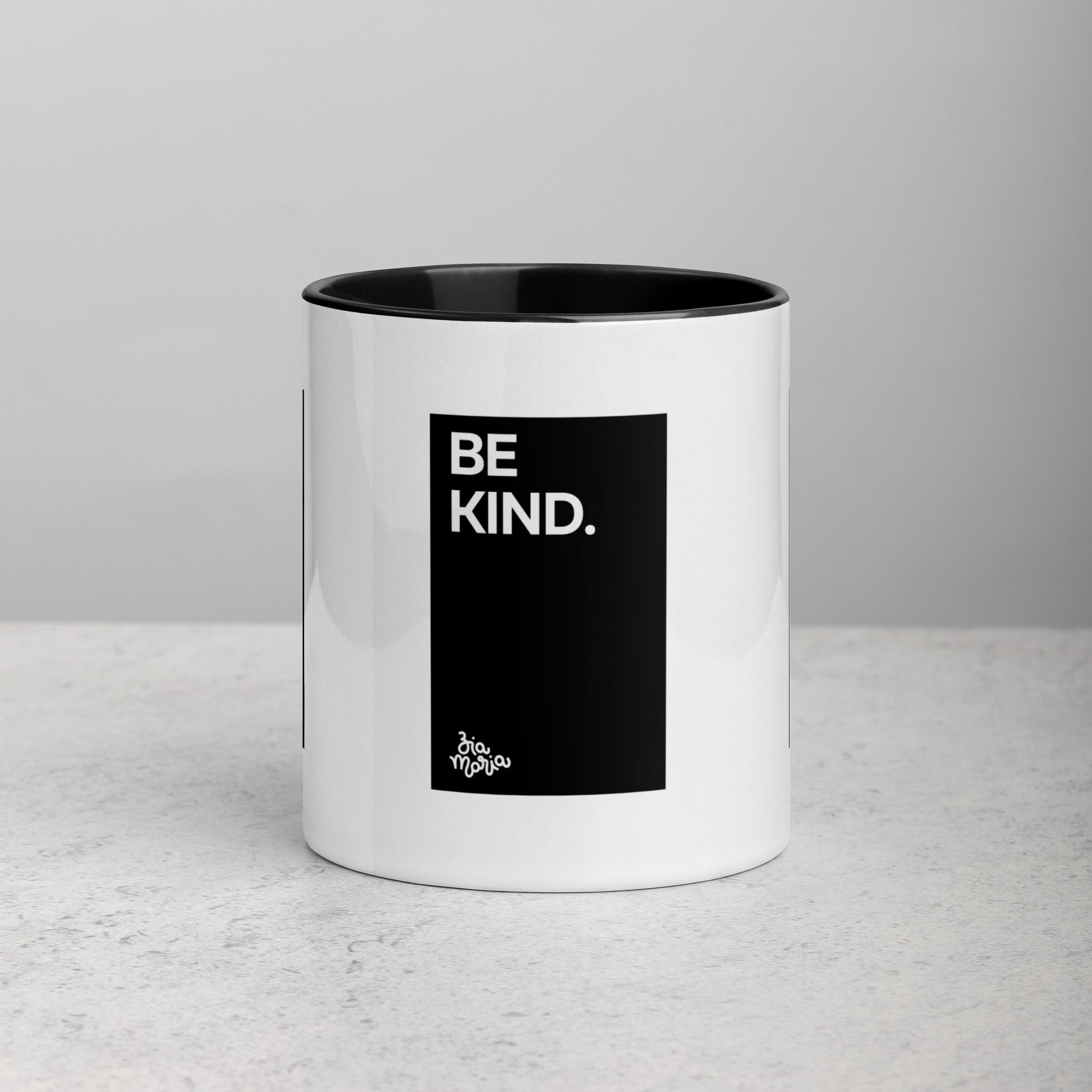 Made from sturdy ceramic and available in multiple colors -yellow, green, red, black, blue, orange, pink- each mug features a colored rim, handle, and interior, with the “Be Kind” square in matching tones.